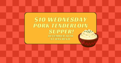 It’s another Wednesday supper special! For only $10 we’ll be serving delicious pork tenderloin, mashed potatoes and braised red cabbage. Kitchen and bar open at 5. Dine in only please.