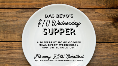 Another $10 Wednesday Supper! We’re serving a ½ lb breaded pork schnitzel on a bed of mashed potatoes topped with brown mushroom gravy for the bargain price of $10. Other menu items and full bar will be available. We open at 5. Dine in only please.