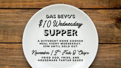 Another Wednesday night, another $10 dinner special! We’ll be having fried cod, fries, & house made tartar sauce. All this deliciousness for $10. Doors open at 5pm. Dine-in only. Full bar and other menu items available. Come hungry and leave happy!