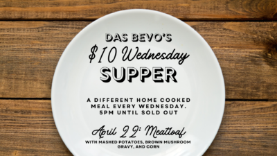 Another $10 Wednesday Supper! We’re serving up meatloaf with corn, mashed potatoes and brown mushroom gravy for the bargain price of $10. Other menu items and full bar will be available. We open at 5. Dine in only please.