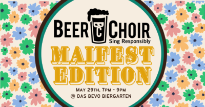 Kicking off Maifest weekend with beer choir in the Biergarten! Kitchen and bar at 5, music 7-9. Beer Choir in the Biergarten! If you’ve never been, Beer Choir is not a performance. It’s a social singing experience open to all, no talent required! Grab a beer, grab a seat, and we’ll lead you through a couple hours of hilarious drinking songs and games.