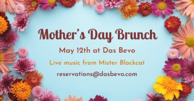 If you’re looking for a fun and casual place to celebrate Mother’s Day with family and friends, Das Bevo is the place. We’ll be cooking up some delicious brunch items, have great drink specials, and live music from Mister Blackcat. Food service is from 10:00am to 2:00pm, live music starts at 11. Please note, this is not a buffet brunch. Reservations are encouraged as it’s a holiday. Please email reservations@dasbevo.com. Cheers!
