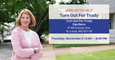 Let’s turn out for Trudy! St. Louis this is your moment to rally behind Trudy Busch Valentine as November 8th is quickly approaching. Swing by and show your support, and also hear from influential leaders in St. Louis City.