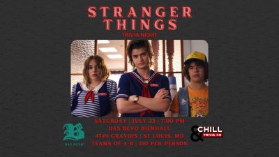 Join us for 8 rounds of Stranger Things Trivia! Trivia will cover all 4 seasons of the popular Netflix series including the upcoming season finale. Compete with or against friends and family for prizes based on the show and be sure to check out the live music in the Biergarten! Sign up your team of 4-8 ($10/person) by messaging Chill Trivia Company on Facebook and Instagram or visit at www.chilltrivia.com